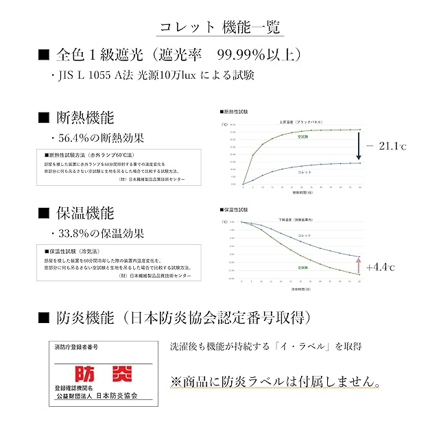 防炎・遮光効果: この生地は防炎加工済みで、遮光1級(99.99%以上)の効果があります。断熱効果(56.4%)と保温効果(33.8%)も期待できます。
