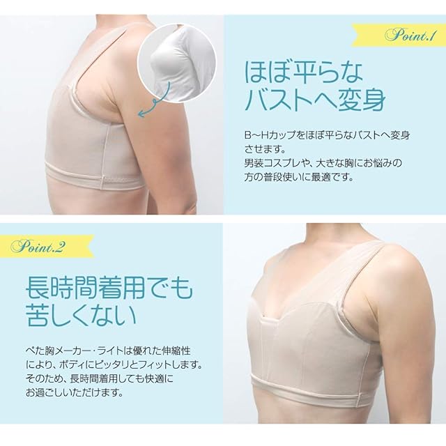 ボリュームのあるバストをほぼ平らにメイク / 和装や男装・ボーイッシュなコスプレ・痩せ見せさせたい人の胸つぶしブラ / グラマーサイズでお困りの方の普段使いにもOK / 胸が大きくても色々な服が着れる / ジョギングなどの運動時、胸の揺れが気にならない / 伸縮性に優れた生地で長時間着用しても苦しくない / 通気性に優れたメッシュ素材 / 脇肉・背中肉をスッキリ補正 / 安心の日本製 / トランスジェンダーも応援します / ≪「ぺた胸メーカー」と「ぺた胸メーカー ライト」の違いについて≫「ぺた胸メーカー」と「ぺた胸メーカー ライト」は生地が違います。「ぺた胸メーカー」は、ヘムサテンを使用。「ぺた胸メーカー ライト」は、パワーネットを使用しておりメッシュ調です。また、メッシュ調のため通気性も良く同じ特許製法ですが、より胸がつぶれるように開発されています。本来ブライダルインナーなどに使われる肌触りが良く段差が出にくい生地を使い、作り上げたこだわりの商品です。