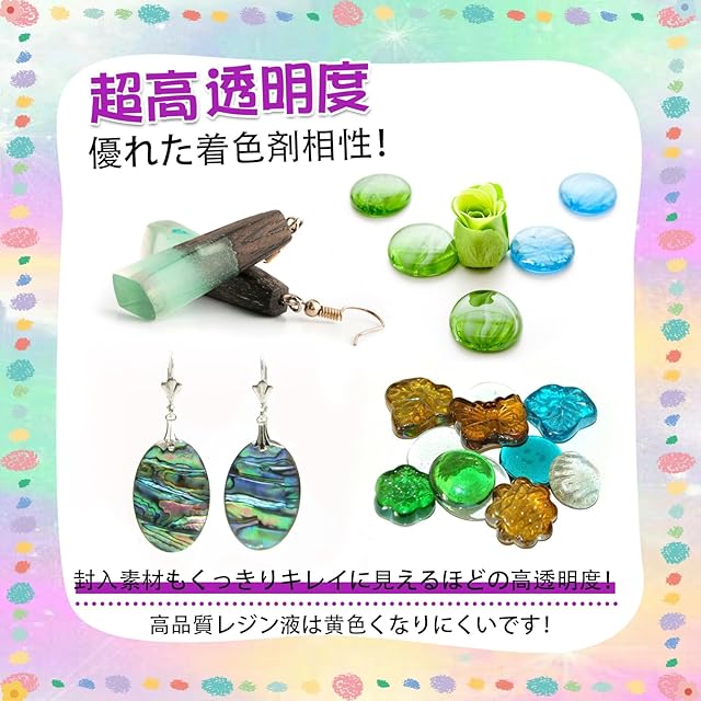 レジン液の高透明感:ガラスのような透明感が、固まったら長い時間でも黄変しない。着色剤との相性も良く、発色はとっても鮮やか! 硬化後、透明度も高く、綺麗に仕上がる。そして時間が経つにつれて簡単に黄色くなることはありません。