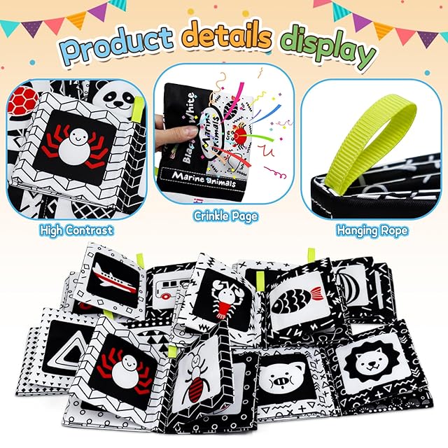 お子様の好み - これらのベービーブックはしわ紙が内蔵しており、ページを触ると、カシャカシャ音ができ、赤ちゃんの注意を引き付け、早期触覚と感覚を喚起できます。小さい手でも掴んでめくりやすいサイズは赤ちゃんにちょうどいいです。洗えるので、お風呂に入っても問題ありません。