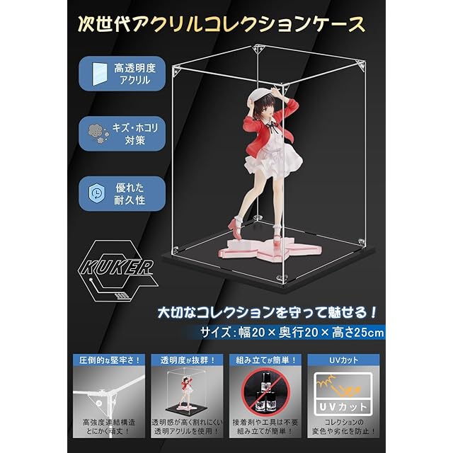 KUKERフィギュアケース アクリルケース UVカット コレクションケース ディスプレイケース 組み立て簡単 頑丈 汚れ防止 手袋 クリーニングクロス付き(20×20×25cm)