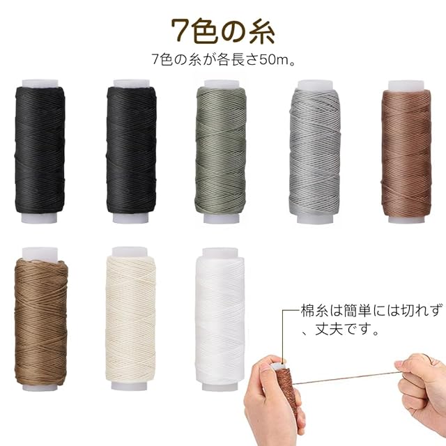 8色の糸:綿糸*8(ブラック、茶、コーヒー、カフェオレ、グレー、オパールグレイ、ベージュ、ホワイト)丈夫で切れにくく、スムーズな縫い心地。