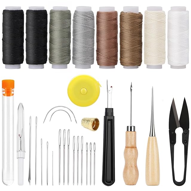 サムコス レザークラフト 革工具セット 裁縫工具 皮革工具 針 手作り 革用 レザー 紐 綿糸 手縫い 工具 DIY (32個セット)