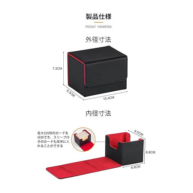 【製品仕様】デッキケース【外部サイズ】縦10.4cm 幅8.3cm 高さ7.8cm 【内部寸法】縦9.5 cm幅6.8 cm高さ6.8cm 【材質】上質PUレザー 【重量】130g 【収納枚数】最大220枚のカードを収納でき、スリーブ付きのカードも簡単に入れることができる、市販されているほぼ全てのカードゲームに対応。 ・スタンダードサイズ63×88mm ・スモールサイズ59×86mm ・など様々なカードゲームに対応しております。