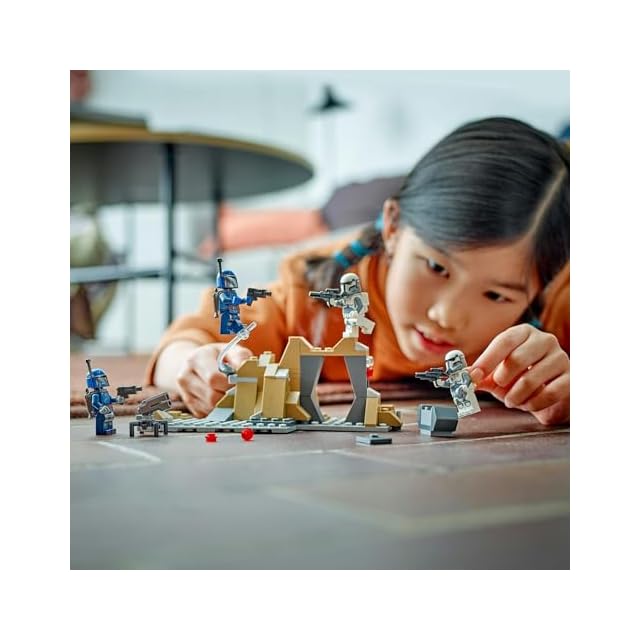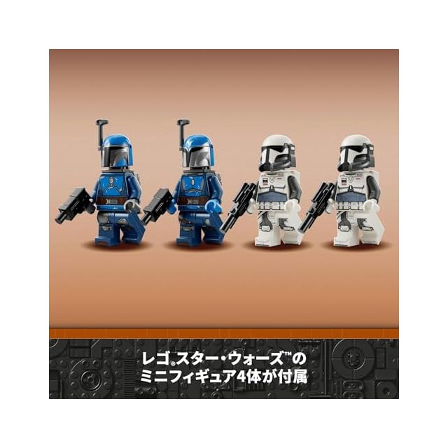 ミニフィギュア4体が付属 – それぞれブラスターで武装した「マンダロリアン ナイト・アウル」と「マンダロリアン・ウォリアー」が、ブラスターピストルを持つ2体の「インペリアル・コマンドー」と戦います。ミニフィギュアにジェットパックが付いています