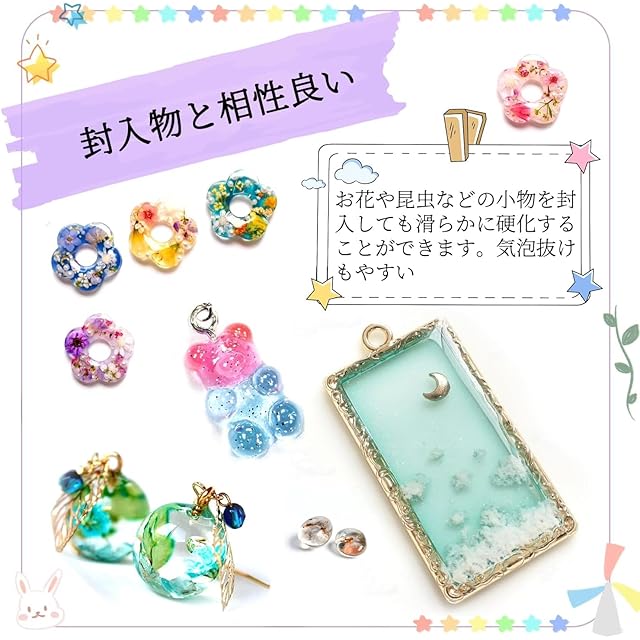 【レジンアート】高い透明度と色の再現性があり、美しい仕上がりを実現します。また、黄変しないため、長期間美しさを保ちます。高品質の素材であり、安心して使用できます。DIYレジンアートだけでなく、ジュエリー作り、クラフト、模型制作にも幅広く使えます。