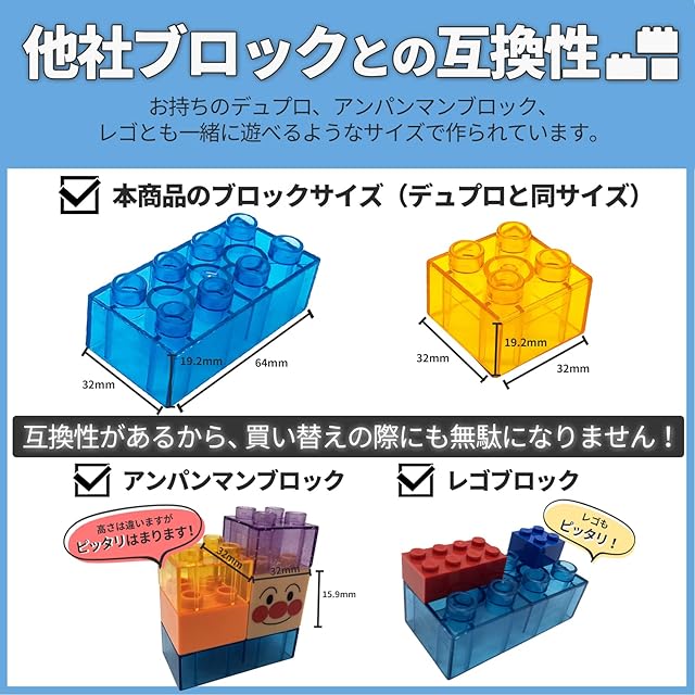 【一緒に遊べるブロック】デュプロ、アンパンマンブロック(ブロックラボ)と同じ規格で作られているので、一緒に遊ぶことができます。
