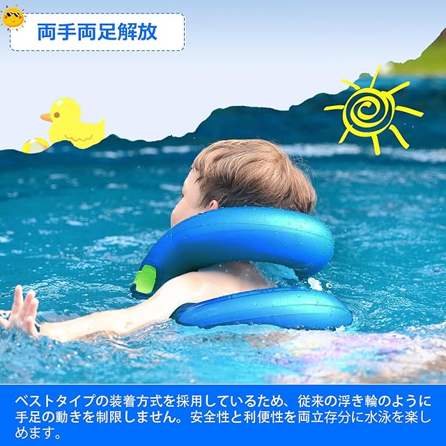 【両手両足解放】ベストタイプの装着方式を採用しているため、従来の浮き輪のように手足の動きを制限しません。空気を注入する方式で十分な浮力を確保でき、安全性と利便性を両立させた、新しいスタイルの水泳補助具です。