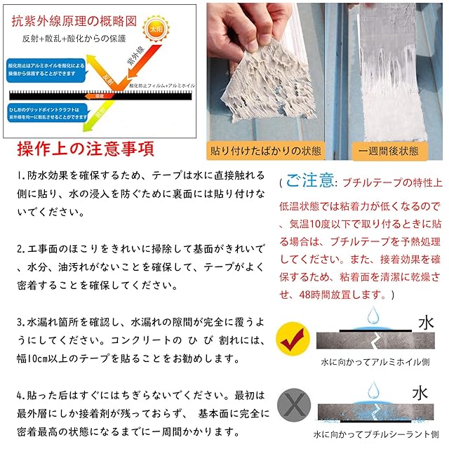 【注意事項】1.水の浸入を防ぐために裏面には貼り付けないでください。 2.水漏れの隙間が完全に覆うようにしてください。コンクリートのひび割れには、はば幅10cmまたは15cmのテープをはる貼ることをおすすめ勧めします。 7.貼った后はすぐにはちぎらないでください。基本面に完全に密着最高の状態になるまでにー周間かかります。