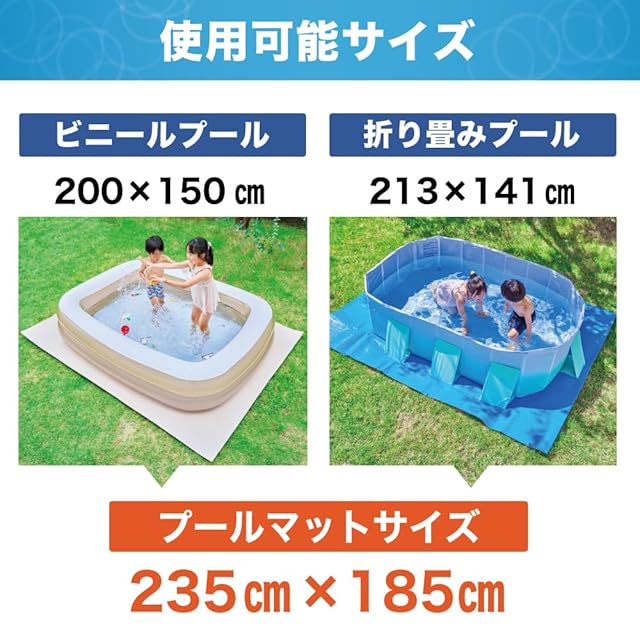 【 極厚プールマット 】プールマットは数多く御座いますが、弊社のプールマットはここが違います!1.水をはじくからお手入れ楽ラク! プールマットは水をはじく素材なので、マットに水が染み込まず、片付けも簡単にできます。2.プールを保護して傷つけない ビニールプールの下に敷くことで底が痛くなりません。プールの保護にもなるので、お子様も思い切り遊ぶことができます。3.マットは厚みがあるから安心 マットは緩衝性に優れた素材を使用しているため、固い地面や砂利の上でもプールを保護してくれます。キャンプなどのレジャーシートや、ストレッチなどのトレーニングシートとしてもお使いいただけます。