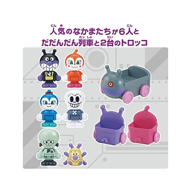 だだんだん列車にばいきんまんとなかまたちを乗せて出発!ころころ動かす手ころがし遊びが楽しめます。
