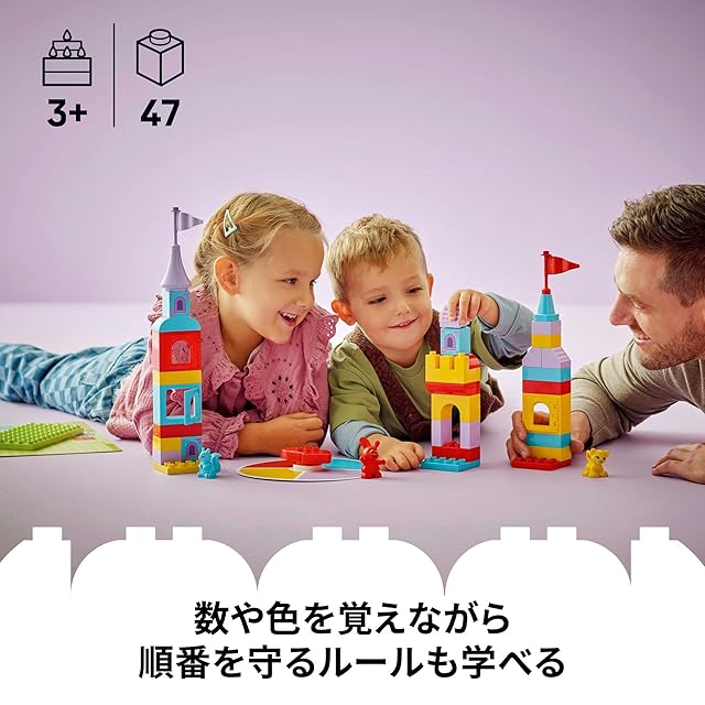 ライフスキルが身につく遊び – スピナー、ゲーム盤、どうぶつフィギュア3体、47ピースのブロックとパーツを使ってお城の組み立てとゲームを楽しめます