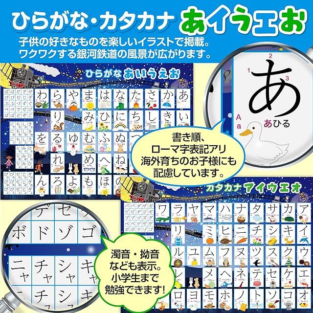 color:すうじのひょう(恐竜)/ひらがなとカタカナとアルファベット(銀河鉄道)お風呂ポスター3種類セット:
