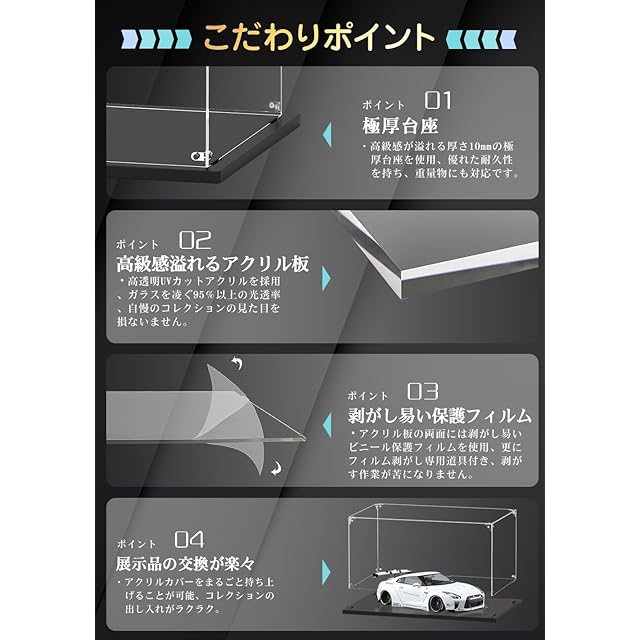 【見栄えアップ】高透明UVカットアクリル素材を使用、大切なコレクションを紫外線によるダメージから守ります。優れた耐久性と高い透明度を兼ね備えているため、ホコリやキズから守ると同時にコレクションをアクリル越しでもキレイに魅せます。