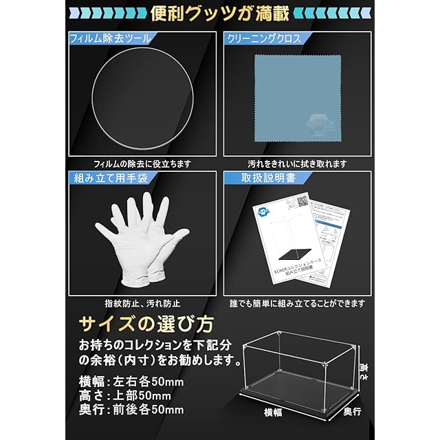 【組立簡単】固定ピンを押すだけの簡単取付、接着剤や工具は不要です。組み立て時に指紋や埃が付かないように手袋とクロスが付属、アクリル面をクリアに保つことが出来ます。アクリル板には剥がしやすい保護フィルムを採用、更にフィルム除去ツール付き。フィギュアケース全体を持ち上げても崩さない、展示物の出し入れが楽々。