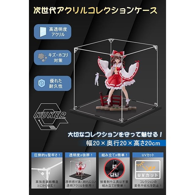 KUKERフィギュアケース アクリルケース UVカット コレクションケース ディスプレイケース 組み立て簡単 頑丈 汚れ防止 手袋 クリーニングクロス付き(20×20×20cm)