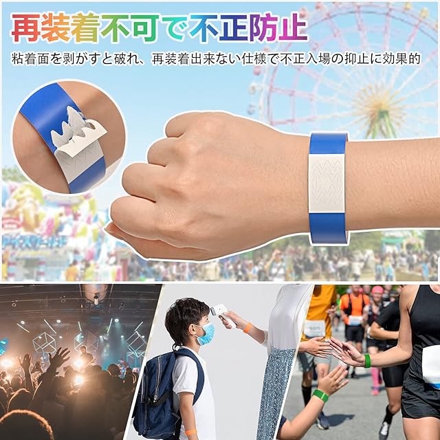 ▲【再利用はできない】非常に強い素材の合成紙製なので、強く引っ張っても接着部分以外が切れることはまずございません。コツはいりますが、重なった部分を強く引っ張ると接着部分が破れて取り外すことが可能です。切れた部分は再度接着して再利用することはできませんので、不正利用の防止に効果を発揮いたします。クラブやライブハウスなどで入場の際に支払い完了の目印として使用いただいております 。