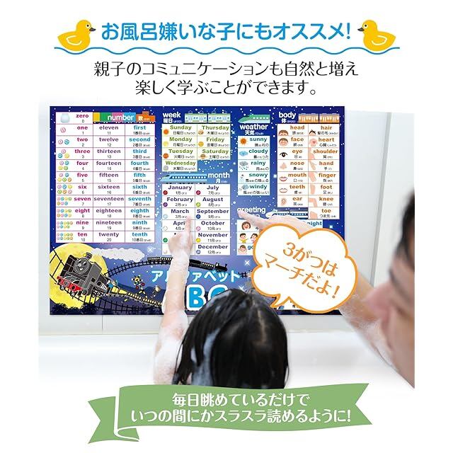 【耐久性と安全性】 ポスターは耐水性があり、お風呂場でも安心して使用できる素材で作られています。これにより、バスタイムを楽しい学びの時間に変えることができます。また、耐久性が高く、長期間使用しても劣化しにくいため、親子で安心して使用できます。長持ちすることで、継続的な学習が可能になります。