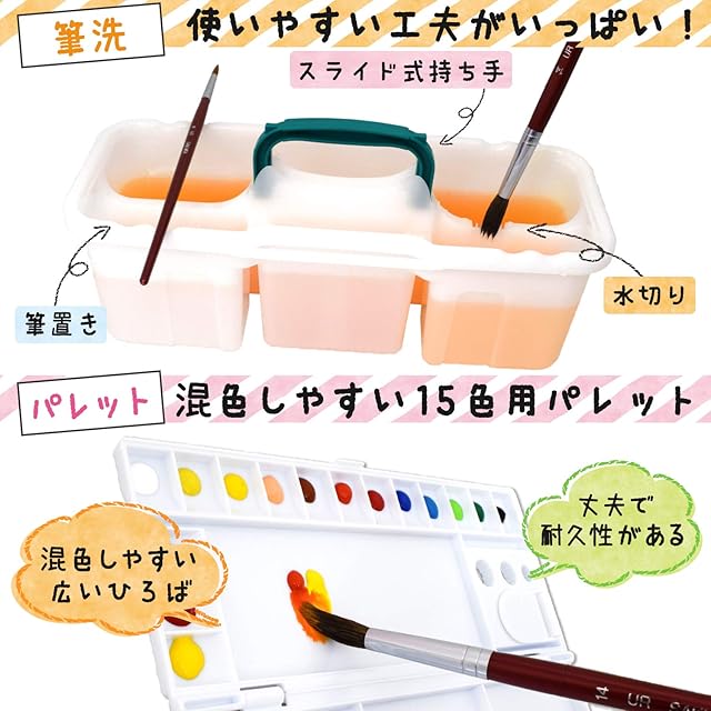 【パレット】15色用パレット【筆洗】4槽に仕切られた大型筆洗・取り出しやすいセンター取手仕様