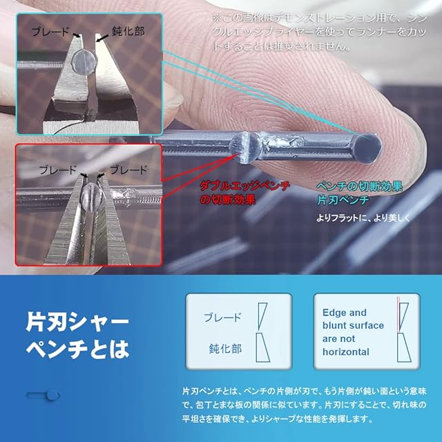 薄刃 片刃 工具:薄刃は部品に近づけて切ることができて、出っ張り少なく、軽い力で切れます。挟み込んで千切るような両刃ニッパーとは違い、片側からの切断で切り終わりが端になるのでカット後が目立ちません