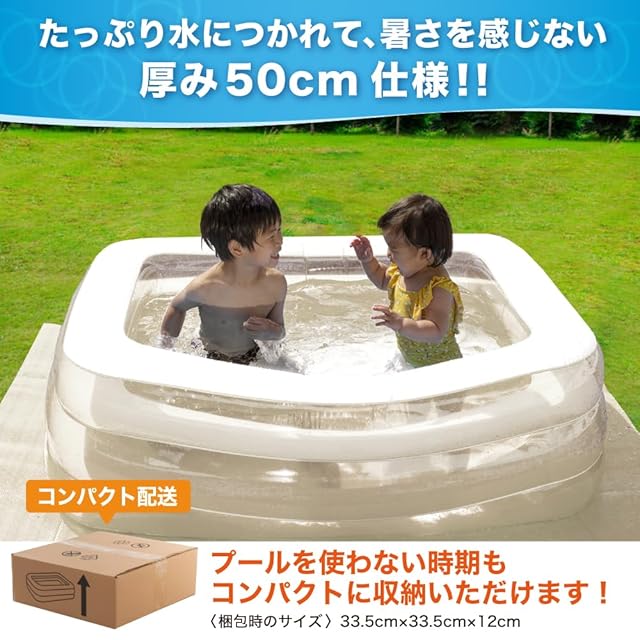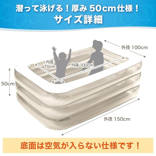 【 ファミリープールとは 】ビニールプールは数多く御座いますが、弊社のビニールプールはここが違います!1.たっぷり水につかれる高さ50㎝ プールの高さが50㎝もあるので、身体全体しっかりと水につかれます。 暑さを感じず、涼しく大型ビニールプールで水遊びすることができます。2.空気入れがラクラク! 空気口は空気漏れを防ぐ3段構造となっています。大人一人でも簡単にビニールプールへ空気を入れることができます。3.プールが透けてるから安心 お子様も、それを見守るご家族も安心して遊べるようにビニールプールの側面が透けている仕様となっています。しっかりとプールの中まで見えるので、安心して楽しく遊ぶことができます。