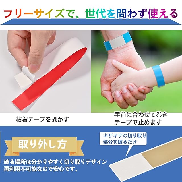 ▲【再利用はできない】非常に強い素材の合成紙製なので、強く引っ張っても接着部分以外が切れることはまずございません。コツはいりますが、重なった部分を強く引っ張ると接着部分が破れて取り外すことが可能です。切れた部分は再度接着して再利用することはできませんので、不正利用の防止に効果を発揮いたします。クラブやライブハウスなどで入場の際に支払い完了の目印として使用いただいております 。