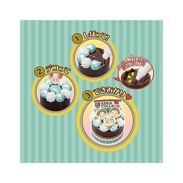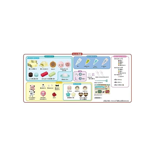 新登場のきらめくパールカラークリームを使って、『SPY×FAMILY』をイメージしたスイーツ作品が作れるセットです。アーニャ&ボンドのフィギュアがのった星形の大きなケーキはケースとしても使えます。上手にしぼれる「パティシエガイドつきスイーツ」入り。