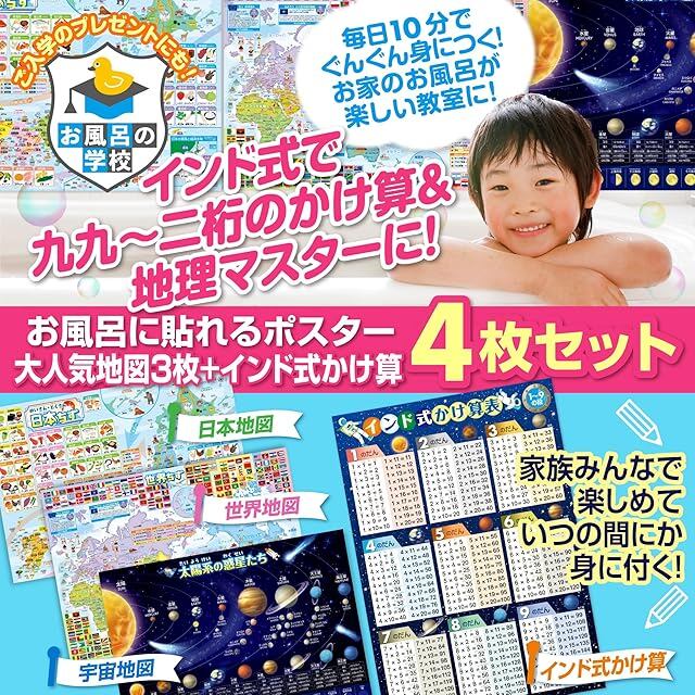 お風呂の学校 セット価格 地図/インド式かけ算(1-9の段)宇宙 お風呂ポスター2種類セット 日本製 地理 学習 知育 社会 算数 九九 B3サイズ 防水