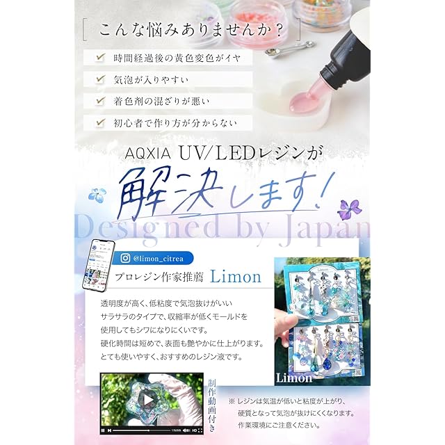 【 レジン作家推薦の品質】 透明 度が高く、低粘度 で 気泡抜け が良いです。 硬化 時間は短めで収縮率も低くシワになりにくいです。プロ作家 Limon さん推薦の uvレジン です