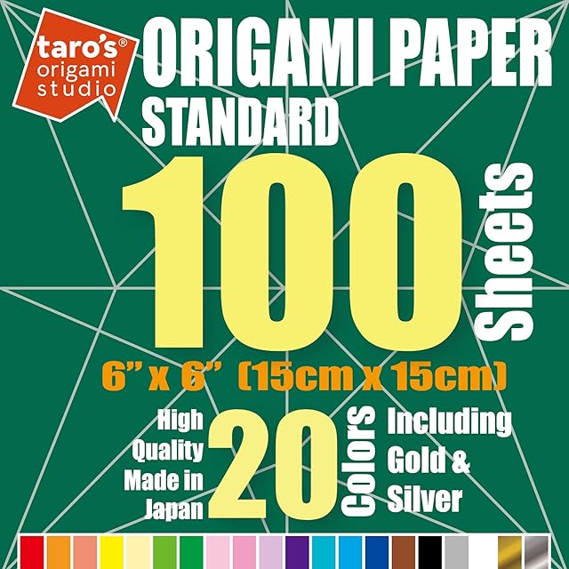 標準サイズ15cm、100枚、20色(片面カラー、片面ホワイト)、ゴールド、シルバー、日本製。Taro's Origami Studioは米国にある折り紙スタジオです。