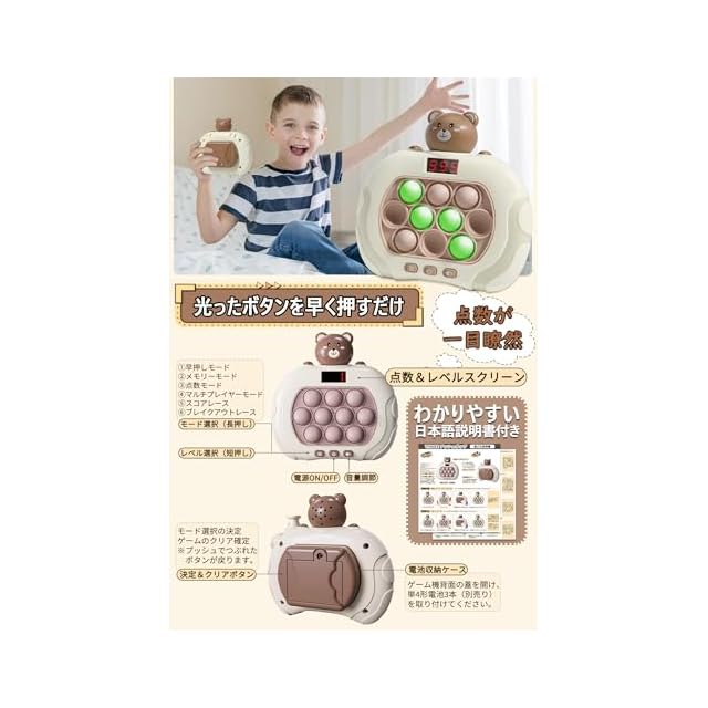 【大人気の知育玩具】もぐらたたきゲームおもちゃは、押しボタン式バブルゲームとエレクトロニックゲームを組み合わせています!電子ポップライトアップゲ一ムは楽しいクリックと動感のリズムで反応カ、手目協調能カ、記憶カ、論理思考能カを鍛えることができ。知育と頭脳ゲ一ムが好きな子供にぴったりです。
