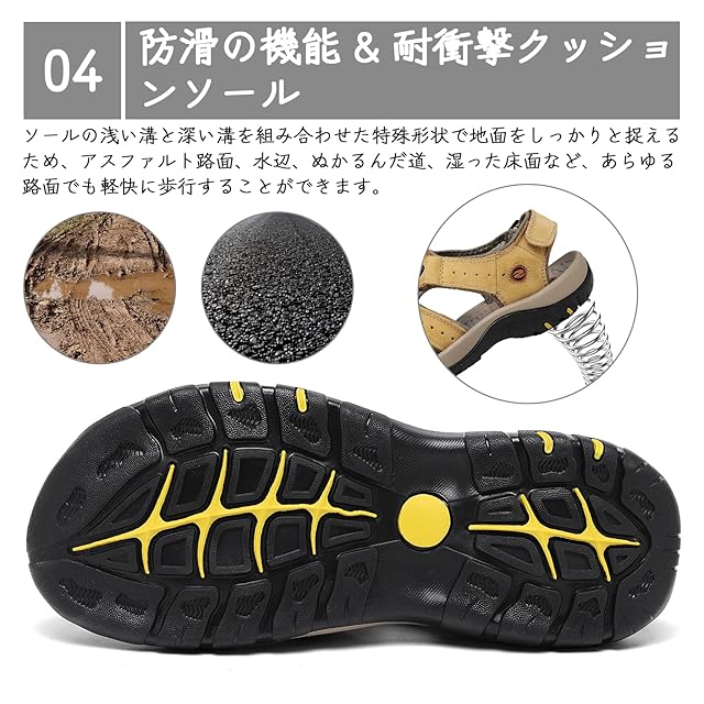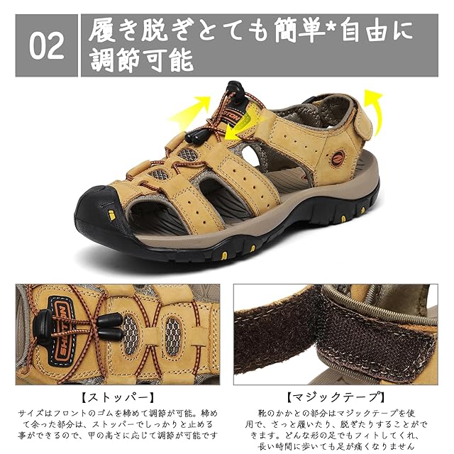 機能性とオシャレを両立したサンダル カジュアル レザーサンダル。便利なマジックテープ。軽量で通気性抜群。しなやかな柔軟性。つま先保護設計。耐衝撃クッションソール。