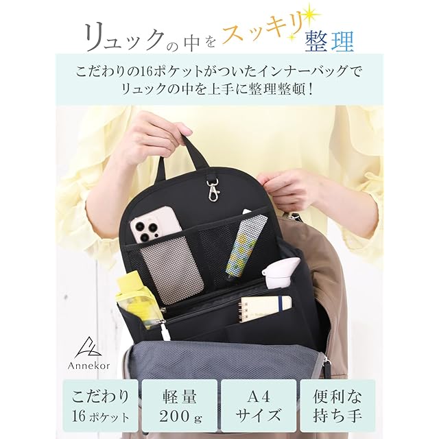 ✅【こだわりの16ポケット】累計で年間2万個以上のバッグインバッグを販売させていただいた実績の中でお客様の様々なお声を反映し、この度リュック版のバッグインバッグを発売させていただきました。使い勝手の良いこだわり機能をぜひお試しくださいませ。A4サイズが入るLサイズと、B5サイズが入るMサイズの2サイズ展開です。<BR> ✅【リュックの中を整理整頓】小物が散らかりがちなリュックサックやトートバッグなどの中身をスッキリ整頓できます! 【サイズ】<Lサイズ>高さ35㎝、幅25㎝、奥行12㎝、重さ190g <Mサイズ>高さ27㎝、幅22㎝、奥行12㎝、重さ160g<BR> ✅【便利な持ち手付】リュックから取り出す際に重要なのが「持ち手の使いやすさ」です。Annekorではバッグインバッグの出し入れがしやすいようにしっかりと握れる持ち手を採用させていただきました。<BR> ✅【自立を助ける底板付き】リュック中でも形が崩れないオリジナルの「底板」や、実用性を重視した「ペンホルダー」、ペットボトルや傘を入れる2か所の「ドリンクホルダー」、2か所のファスナーポケットなど、様々な使いやすい機能を是非お試しくださいませ。<BR> ✅【類似品にご注意ください】見た目の画像は同じような商品でも、作る工場や品質・対応は全く違います。サイズが違った、色が画像と違う、連絡をしても返事がない等色々なトラブルがございますので、販売業者は慎重にお選びくださいませ。お買い物は真心をこめて販売をさせていただいております日本企業でよろしくお願いいたします。