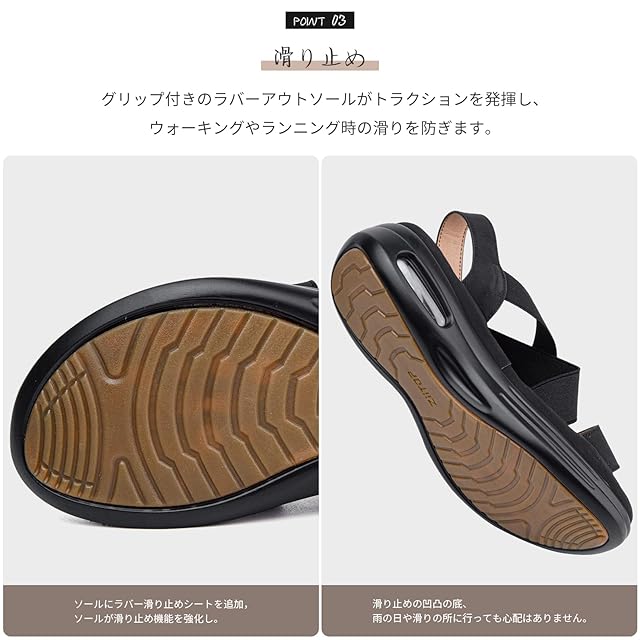 【滑り止め】グリップ付きのラバーアウトソールがトラクションを発揮し、ウォーキングやランニング時の滑りを防ぎます。滑り止めの凹凸の底、雨の日や滑りの所に行っても心配はありません。