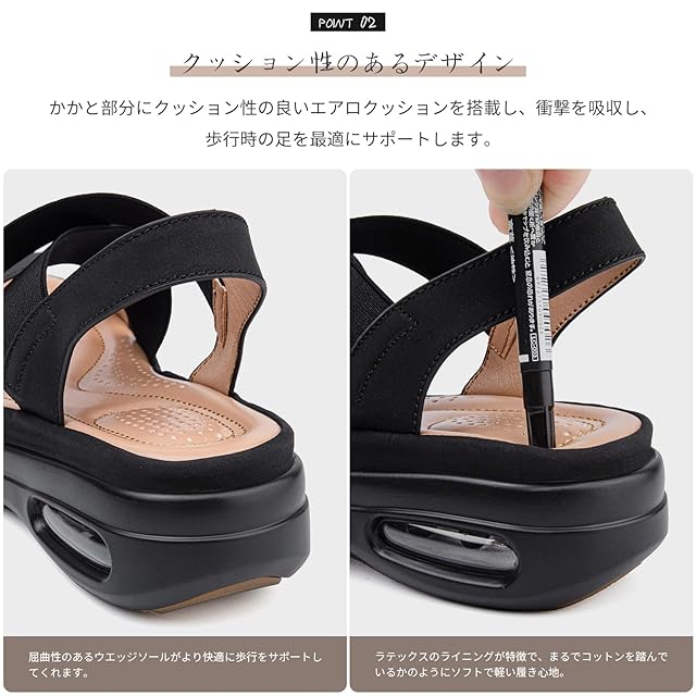 【衝撃吸収設計】かかと部分にクッション性の良いエアロクッションを搭載し、衝撃を吸収し、膝への負担を軽減し、歩行時の足を最適にサポートします。ラテックス製のライナーを備えたこのスポーツサンダルを履けば、コットンを踏んでいるようにソフトで軽い履き心地が味わえる。