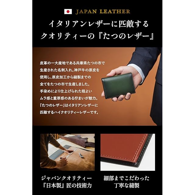 本製品に使用している革は、兵庫県たつの市で鞣した国産皮革です。 たつの市は、兵庫県の西播磨地域に位置し、北の山地から南の瀬戸内海まで、南北に長い地形の中を林田川が流れている大自然環境に恵まれたエリアです。 革の鞣しには多くの水を使いますが、この大自然が育む軟水を使用することにより、イタリアンレザーにも負けない程に革の耐久性が上がり、劣化しづらい革になります。 兵庫県で生産される革素材は、全国シェアの約70%を担いますがそのうちのほぼ半分をたつの市が占めています。 それが信頼のおけるたつの市で生まれた【たつのレザー】です。