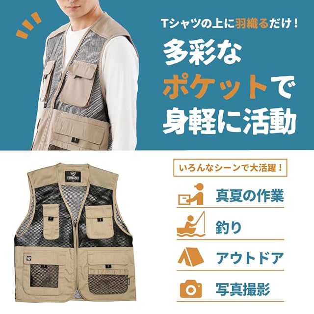 通気性抜群のメッシュベスト。前面には機能的にポケットを配置しながらもメッシュをふんだんに取り入れ、涼しさを確保しました。収納量がしっかり取れるマチ付ポケットを採用し、中の物が落ちにくいマジックテープ開閉のフラップが付いています。背中部分は通気性を重視し全面メッシュで仕上げました。暑い季節の作業からレジャー・フィッシングまで、多用途にお使いいただけます。