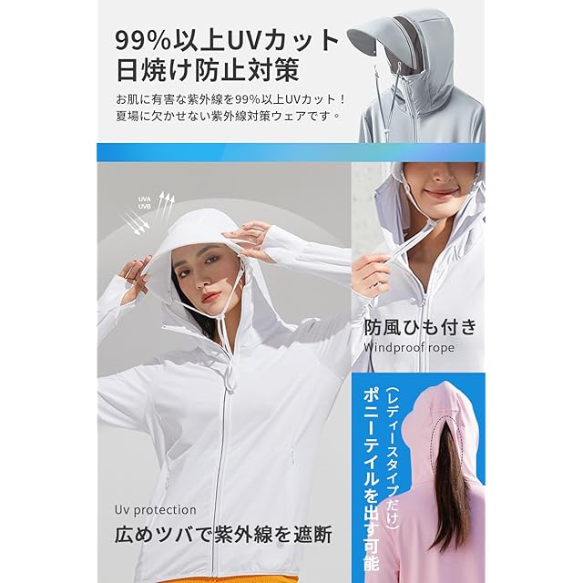 【細部までこだわった性能】取り外し可能なキャップのつばを広くして、ハイネックを搭載し、日焼け止め面積を拡大し、直射日光を多めに遮蔽し、日焼け防止効果が期待できます。フロントファスナーは顔まで伸ばしているので、ケアしづらい首と顔もラッシュガードで肌を守ります。レディースタイプはフードの後ろにはファスナーが付いて、ハイポニーテールを出す可能、蒸れを気にすることなく着用いただけます。