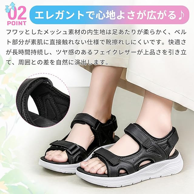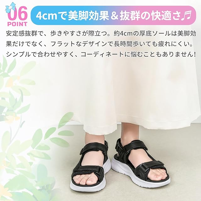 【履きやすい厚底サンダル】接地面から、つま先で約3cm、かかとで約5cmの高さのソールです。約2cm程の高低差の傾斜で負担なく履けるサンダルです。適度な体格比率をアップし、美脚効果を実現、自信を増強します。それぞれの一歩は全て気楽であり思いのままにすることができます。
