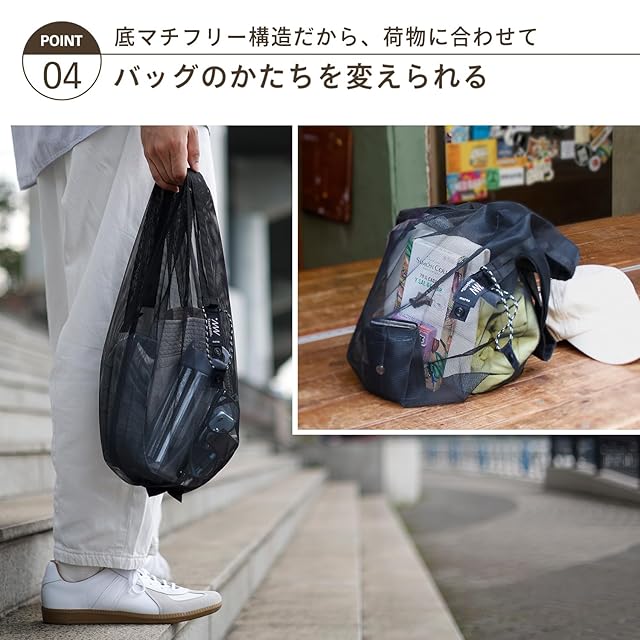 【スタイリッシュな雰囲気】十分な強度がありながら、 中がほどよく透ける細やかなメッシュ素材。 表面にはやさしい光沢があり、カジュアルからスタイリッシュまで様々な雰囲気に合います。底マチフリー構造で、 荷物に合わせてバッグのかたちが変わります。