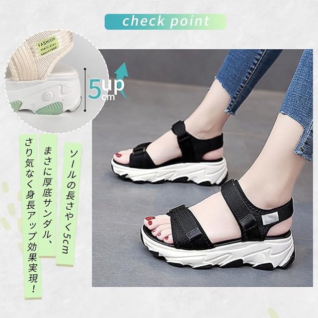 【5cmアップ】洒落性を重視しつつ、ソールの長さもやく5cm程に作られていて、まさに厚底サンダル、さり気なく身長アップ効果実現!