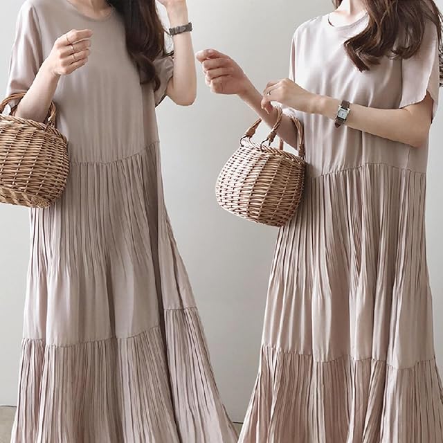 [FEISEDY] ワンピース レディース 大きいサイズ ゆったり 知的 丸首半袖 無地 着瘦せ ロング ワンピース おしゃれ カジュアル エレガント シフォン ドレス 夏 A8107