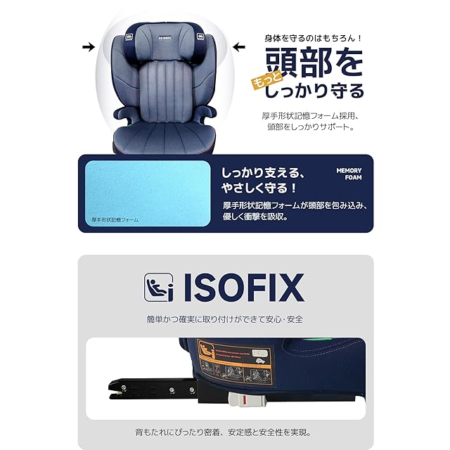 【へッドレストの安全性能】柔らかなヘッドレストが特徴で、子どもの頭部をしっかりと保護する設計となっています。表面はソフトな素材を使用しているため、側面からの衝撃時にも頭へのダメージを軽減。また、内部には高強度の耐衝撃素材が層状に配置され、各層が衝撃エネルギーを効率的に分散・吸収することで、万が一の際の安全性を高めています。