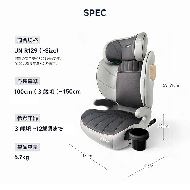 【新安全基準 R129適合】従来の基準よりも向上した安全性が実現されています。R129の試験基準に基づいて設計されているため、側面衝突など様々な状況下でお子様を守るための衝撃吸収性能が高く、実際の走行環境での安心感を提供します。また、使用者のフィードバックを反映した細部の設計も特徴であり、正しい固定方法やお子様の成長に合わせた調整が可能な点が評価されています。