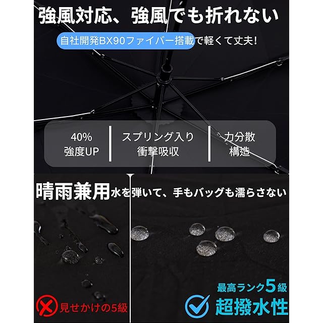 【強風でも、豪雨でも。これ一本で安心】 急な突風や横なぐりの雨——そんなときでも、この傘があればもう大丈夫。 FANACANの折りたたみ傘は、特別設計のBX90ファイバー×アルミ合金の親骨構造で、一般的な傘より約1.4倍の強度を実現。風にあおられて裏返ったり、すぐ壊れたり…そんな心配がぐんと減ります。 しかも、広げれば直径100cmの大きいサイズ。スーツもリュックも、しっかりカバーしてくれます。 通勤や通学はもちろん、旅行やアウトドアにもぴったり。 たたむとコンパクトで持ち運びもラクラク。バッグに入れておけば、どんな天気でも安心。