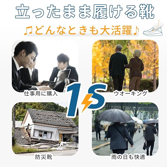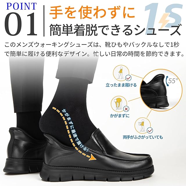 「立ったまま簡単に履ける手を使わない設計」この靴ベラいらずの靴は手を使わず、立ったまま1秒で履けるため、腰をかがめる必要がありません。忙しい朝や外出前の準備が楽々。通勤や買い物、旅行だけでなく、シューズを脱ぎ履きすることが多い老年人の散歩にも最適です。家族への思いやりとして、父の日の贈り物としてもぴったりの一足です。