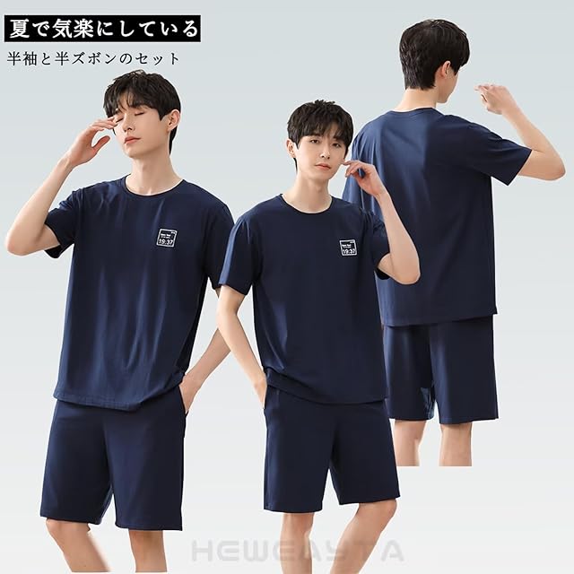 商品名:[HEWEAYTA] パジャマ メンズ 夏 半袖 - ルームウェア 上下セット 半袖ショートパンツ 部屋着 薄手 綿 軽い 吸汗(ダークブルー,M)