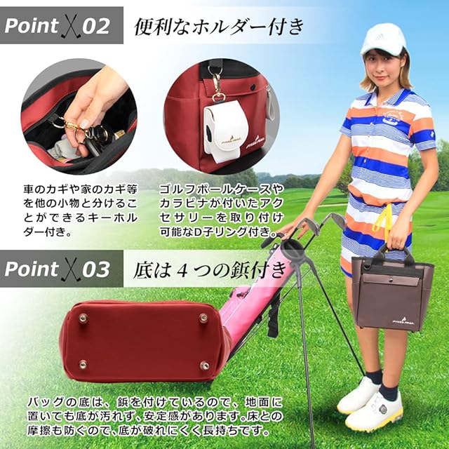 ✅【機能性の高いホルダー/安定性抜群の底鋲】収納ポケットの他にも、車や家の鍵を他のものと混ぜないようにする「キーホルダー」やゴルフボールケースやカラビナを取り付けることができる「Dリング」も付いているため、物がごちゃごちゃになる心配がありません。また、バッグの底には「4つの鋲」がついており、地面にバッグを置いても底が汚れず、安定性もあります。また、底が地面に触れないことで、破れにくく長持ちします。