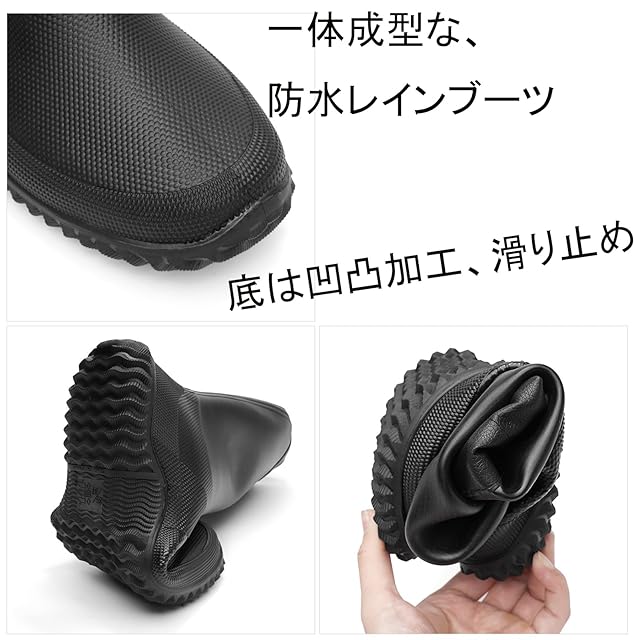 完全防水レインブーツ:一体成型なので継ぎ目がなく完全防水となります。履き口にも絞れるフード付き、雨の侵入をしっかりブロックされます。雨や雪の日に濡れる心配がありません。