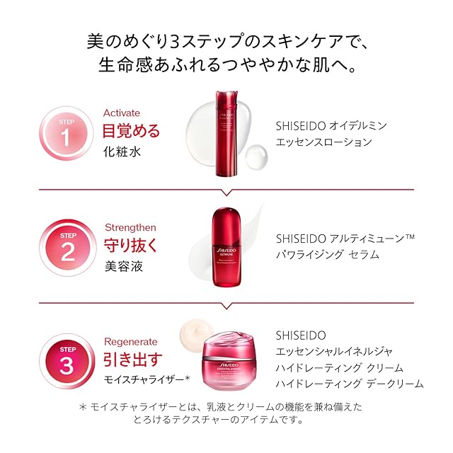 「販売名:SHISEIDO オイデルミン エッセンスローション」あなたの美しさを日々、更新。 生命感あふれるつややかな肌が続く。 今まで発揮しきれていない、美の回復に着目。乾燥や環境変化に負けない、美しい肌サイクルを目指して、悪いものを取り除き、良いものを取り入れる習慣を。 角層のすみずみまで素早く浸透し、乾燥による小ジワを目立たなくします。* 輝くような透明感と、うるおったなめらかな肌へ導きます。 *効能評価試験済み。SHISEIDO オイデルミン エッセンスローション 特製サイズ(30mL)付き。